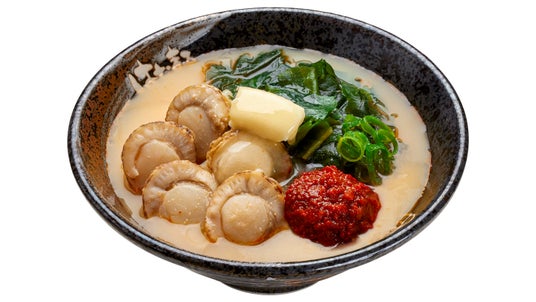 「ホタテ味噌バター」は、ベビーホタテを贅沢に盛り付け、さらにわかめとバターをトッピングしています。特製味噌スープにバターが溶け出し、バターの香りと磯の香りが楽しめます。ホタテとわかめの食感もアクセントになります。ホタテの上品な旨みが楽しめる贅沢な一杯です。