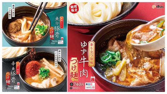 【はなまる】讃岐うどんで味わう、個性際立つつけ麺3種が新登場!ボリューム満点!「ゆず牛肉つけ麺」「魚介豚骨つけ麺」 「辛魚豚骨つけ麺」
