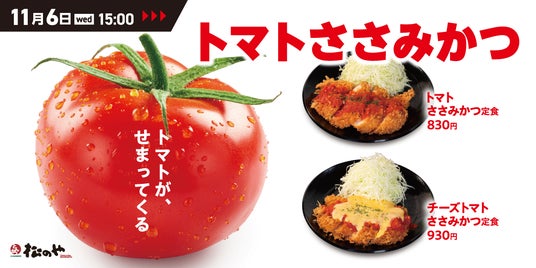 株式会社松屋フーズ(本社:東京都武蔵野市、代表取締役社長:瓦葺 一利)では、とんかつ専門店の「松のや」におきまして、2024年11月6日(水)午後3時より、「トマトささみかつ」を発売いたします。