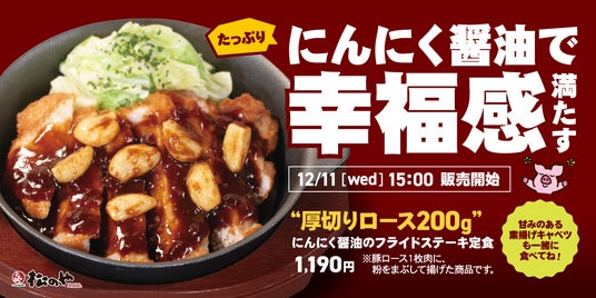 株式会社松屋フーズ(本社:東京都武蔵野市、代表取締役社長:瓦葺 一利)では、とんかつ専門店の「松のや」におきまして、2024年12月11日(水)午後3時より、「にんにく醬油のフライドステーキ」を発売いたします。