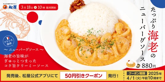 このたび松屋フーズ(本社:東京都武蔵野市、代表取締役社長:瓦葺一利)では、牛めし・カレー・定食・その他丼の「松屋」におきまして、2025年3月18日(火)10時より「たっぷり海老のニューバーグソース」を販売いたします。