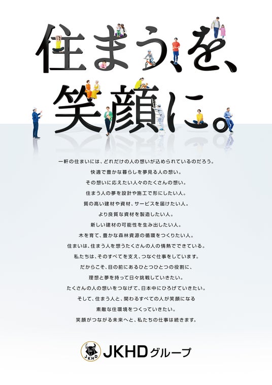 JKホールディングス株式会社(本社:東京都江東区、代表取締役社長:青木慶一郎)は、グループ全体の一体感と価値観の共有を目的に、JKホールディングスグループの新たなグループスローガン「住まう、を、笑顔に。」を策定しました。