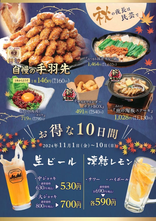 11/1(金)からは、生ビールや凍結レモンサワーなどがお得にお召し上がりいただける『秋のアルコールフェア』もスタートいたします。