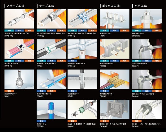 因幡電工カンパニーでは、1991年に業界初の冷媒配管用防火区画貫通部材となる耐火パイプ「IRP」を開発、2000年には改正建築基準法に対応する耐火キャップN「IRC-N」などの「1時間耐火」製品シリーズを開発し、その後も火災時の延焼抑制と騒音低減を実現した耐火遮音カバー「IRSP」を開発。