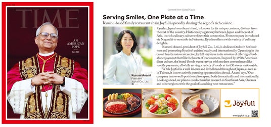 ファミリーレストラン ジョイフル (本社:大分県大分市 代表取締役社長:穴見くるみ) は、米国の権威あるニュース雑誌「TIME(タイム)アジア版」の2025年5月26日発売号にて、代表取締役社長の、穴見くるみのインタビュー記事が掲載されたことをお知らせいたします。