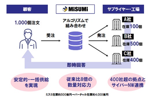 独自開発のシステムにより、国内外400社超のサプライヤー在庫と工場の生産キャパシティをサイバーネットワーク化し一元的に把握することで、提供可能な数量を大幅に拡大しました。また、お客さまの希望数量に対し、その情報を瞬時に組み合わせて価格と納期を自動で表示するアルゴリズムを開発し、大量注文であってもECサイト上で迅速に対応することを可能にしました。