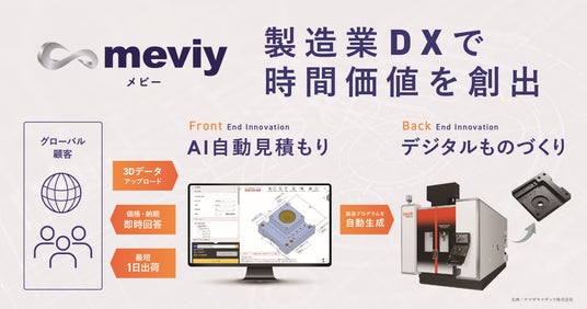meviyは機械部品の3DデータをアップロードするだけでAIが自動で即時見積もり、独自のデジタル製造システムにより最短1日での出荷を実現します。これまで、機械部品調達時に発生していた作業時間の9割以上を削減することで、お客さまの部品調達における非効率を解消するプラットフォームです。4年連続で国内シェア