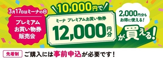 ミーナ天神、ミーナ京都、ミーナ町田、ミーナ津田沼の4館にて、3月17日「ミーナの日」を記念し、12,000円分を10,000円でご購入いただける「ミーナ プレミアムお買い物券」を数量限定で販売いたします。ご購入には、4館ごとに特設サイトからの事前申込をお願いいたします(3月17日10時より受付開始)。販売日は4館ごとに異なります(ミーナ天神:3月21日(金)・22日(土)、ミーナ京都:3月22日(土)、ミーナ町田:3月22日(土)、ミーナ津田沼:3月29日(土)) 。3月17日「ミーナの日」を記念した2,000円もお得な「ミーナ プレミアムお買い物券」を是非、事前申込のうえ、ご購入いただき、春のお買い物、お食事にご利用くださいませ!