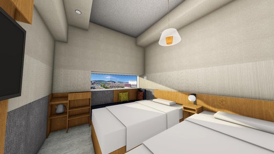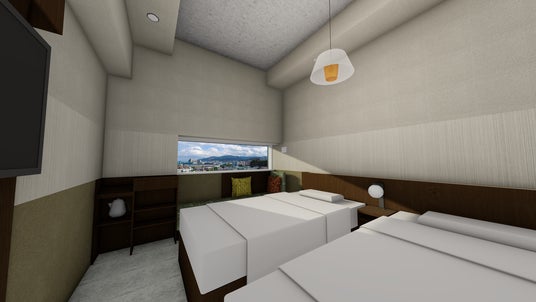 客室は、水平窓から望む小樽の海と山の景色をモチーフに、ブルーとグリーンを基調とした2種類のデザインで構成。客室内部のデザインは建築の「積む」というコンセプトに呼応し、横基調の空間と小樽の豊かな自然を表現したナチュラルなカラーによって彩られています。