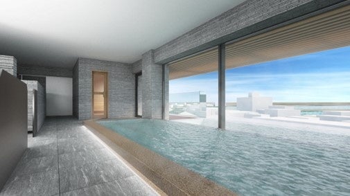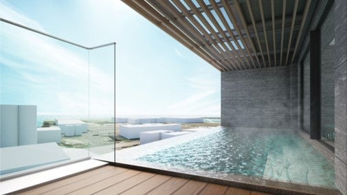 内部浴槽と露天風呂が続いているかのようなデザインの大浴場。小樽湾の海と浴槽が一体化するようなデザインは、小樽でのひと時をより一層お楽しみいただけます。