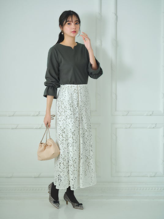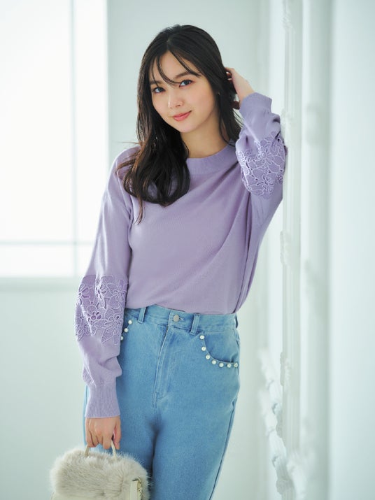 ■特長:袖のレースがエレガントなニットプルオーバー。カシミヤタッチ素材で、ふんわりやさしい肌ざわりです。袖にあしらわれた刺繡レースが上品な印象を与えます。さまざまなボトムに合う絶妙な丈と、着ぶくれしにくくほんのりゆる感のあるシルエットもポイントです。